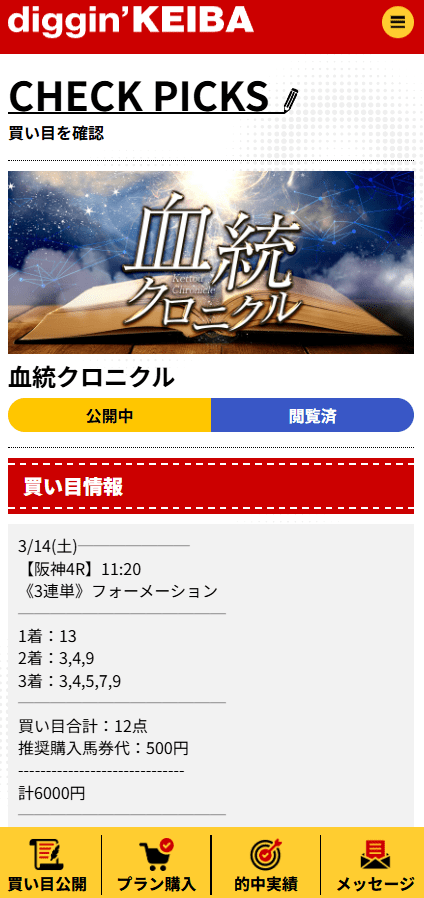 買い目って、見る人が見れば情報のレベルがけっこう出ると思っています。血統クロニクルはその典型でした。阪神4Rで1着13番が8番人気、2着3番が4番人気、3着7番が1番人気。人気の中心だった7番を頭にしないで、8番人気の13番を頭固定にしている時点でかなり面白い。しかも2着に4番人気を置いているので、適当に荒れ待ちしているわけでもない。この形で43万1800円なら、情報としてかなり質が高いと思います。