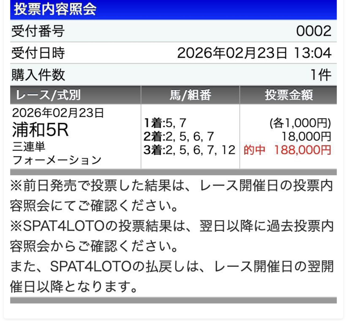 指示通りの馬券代(総額5000円)で配当額は1万2650円