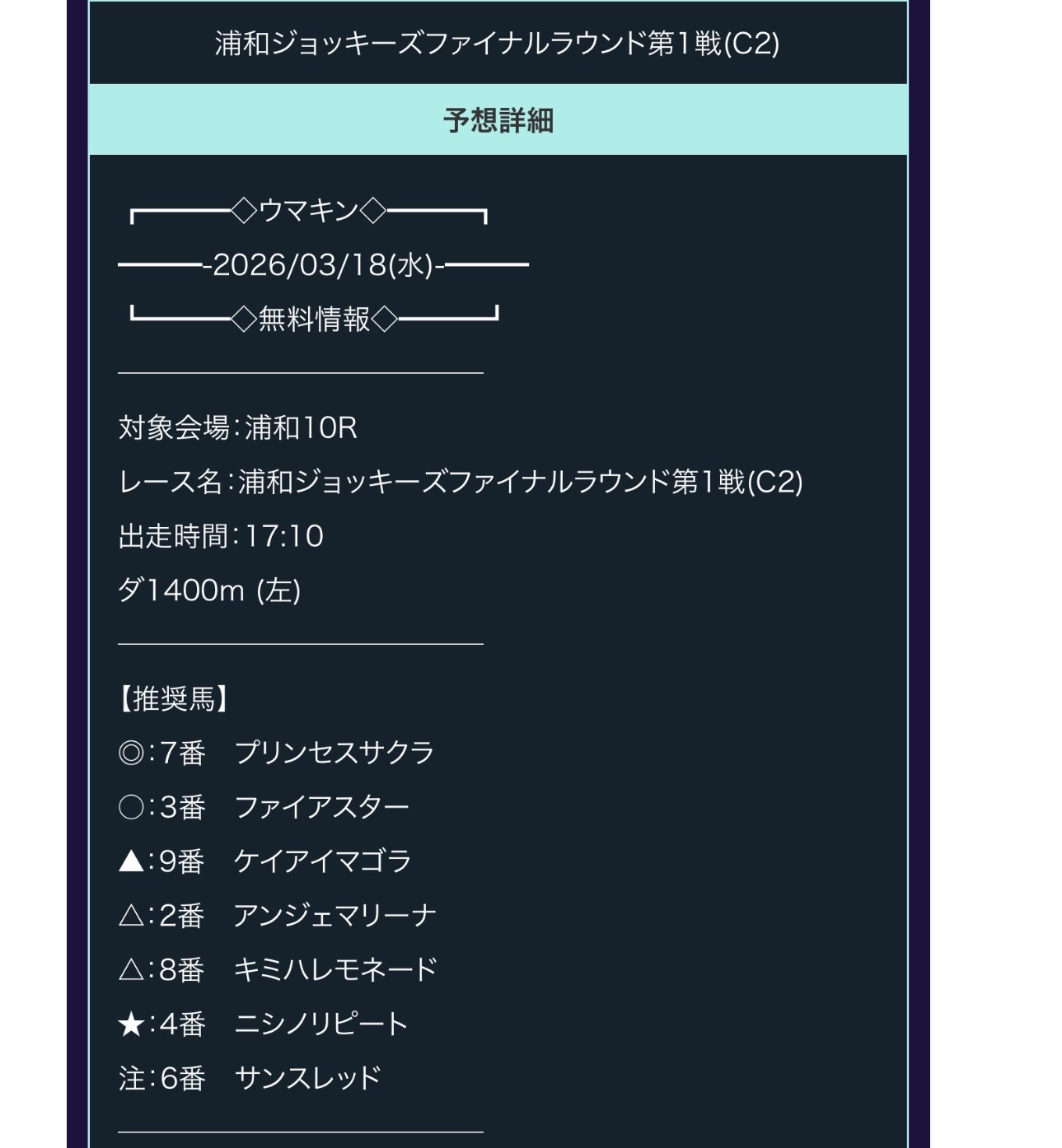 ウマキンはそのレースの1レース前の浦和10Rの買い目を公開